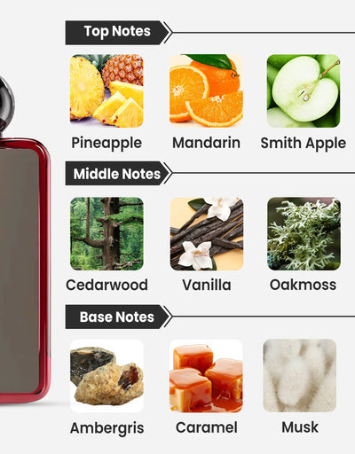 The scent kicks off with a bold burst of pineapple, mandarin, and crisp Granny Smith apple, creating a vibrant and energetic opening. In the heart, cedarwood, oakmoss, and vanilla add a warm, inviting edge. The base rounds it all off with luxurious caramel, dry woods, ambergris, and musk, leaving a deep, lasting trail.