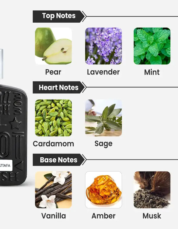 The fragrance opens with pear, bergamot, mint, and lavender, delivering a lively, invigorating burst. The heart reveals sage and cardamom, adding aromatic depth and masculine spice. Finally, the base settles into vanilla, amber, musk, and patchouli, creating a warm, sensual, and long-lasting finish.